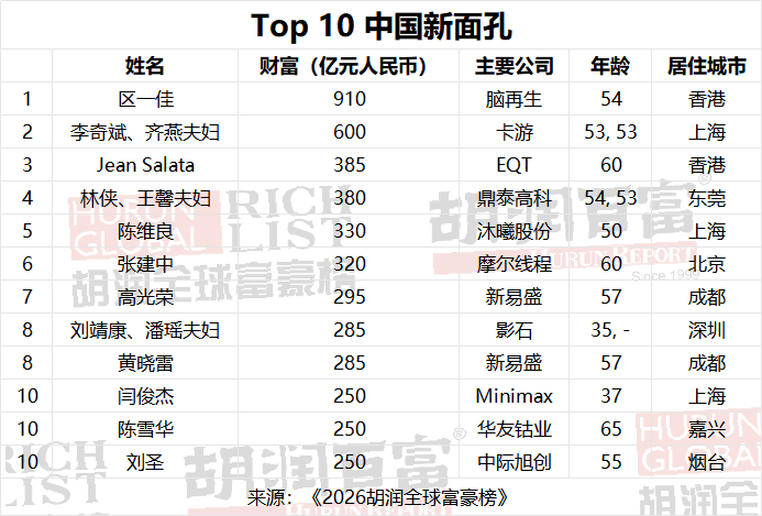 为首,他的财富增加了1300多亿元人民币,达到5500亿元人民币;其次是马化腾,财富增至4650亿元人民币。寒武纪41岁的陈天石,财富翻了一倍,达到1750亿元人民币;光模块龙头中际旭创的王伟修,财富增长近5倍,达到1050亿元人民币;李彦宏财富增至840亿元人民币;江波龙的蔡华波财富增至520亿元人民币。此外,其他互联网巨头也表现强劲,马云财富增长50%,达到2300亿元人民币;丁磊财富增长33%,至3100亿元人民币。消费品领域今年表现亮眼,领头的是瓶装水巨头农夫山泉的钟睒睒,其次是两家收藏玩具龙头企业——泡泡玛特的王宁和卡游的李奇斌,以及两家黄金珠宝头部企业——周大福的郑家纯和老铺黄金的徐高明。新能源板块同样表现不俗,由电池制造商宁德时代的曾毓群、储能制造商阳光电源的曹仁贤和无锡先导智能的王燕清引领。创新药领域快速增长,翰森的钟慧娟财富增长超过一倍,达到1600亿元人民币;其他领军者包括香港专注于多动症和自闭症中药研发的脑再生的区一佳、癌症药物制造商百利天恒的朱义。船舶制造业务蓬勃发展,恒力的陈建华财富翻了一番,达到2500亿元人民币。中国在AI和半导体领域取得了突破性进展。新上榜者涵盖两大核心赛道:一是芯片与硬件领域,包括沐曦股份的